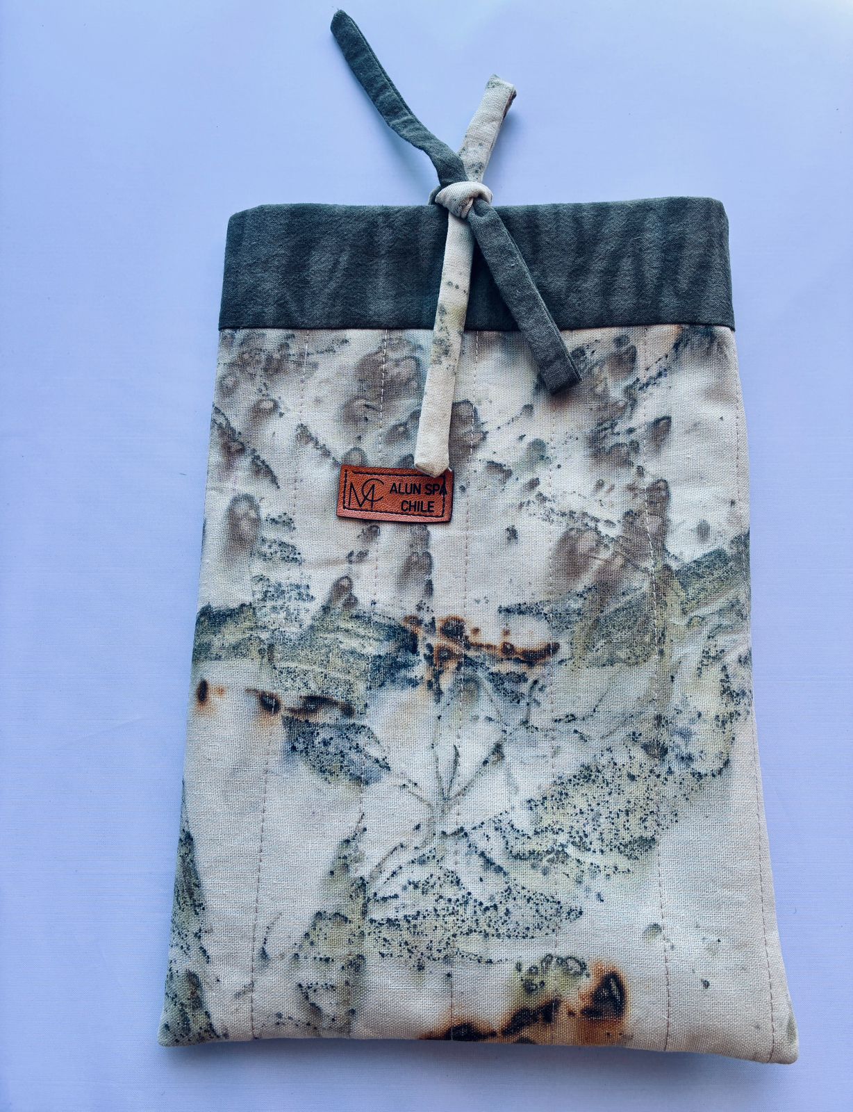 Funda para libro de 28 x 19 cm (medidas exteriores), confeccionada en algodón con teñido botánico y forro interior impermeable, pensada para proteger ese tesoro que llevas contigo. Una pieza única, hecha a mano, que resguarda tus libros de la humedad y el uso diario con belleza y sentido.